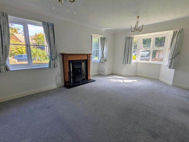 Dual-aspect living room with open fire and double doors to the hallway.